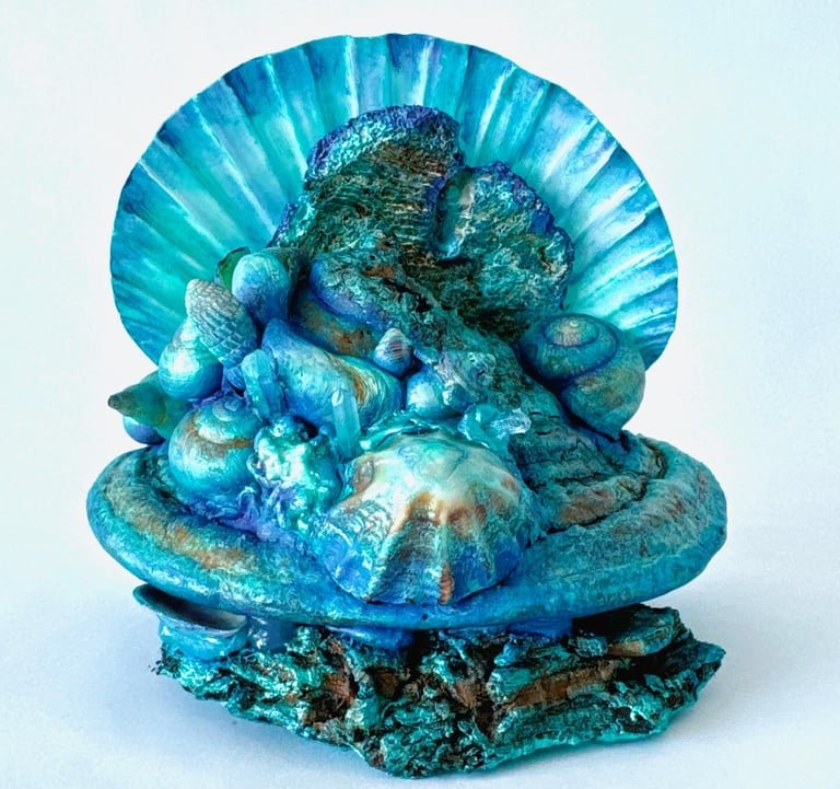 Medium: composées intuitivement d’éléments naturels comme des coquillages, pierres, champignons, fragments offerts par la Terre